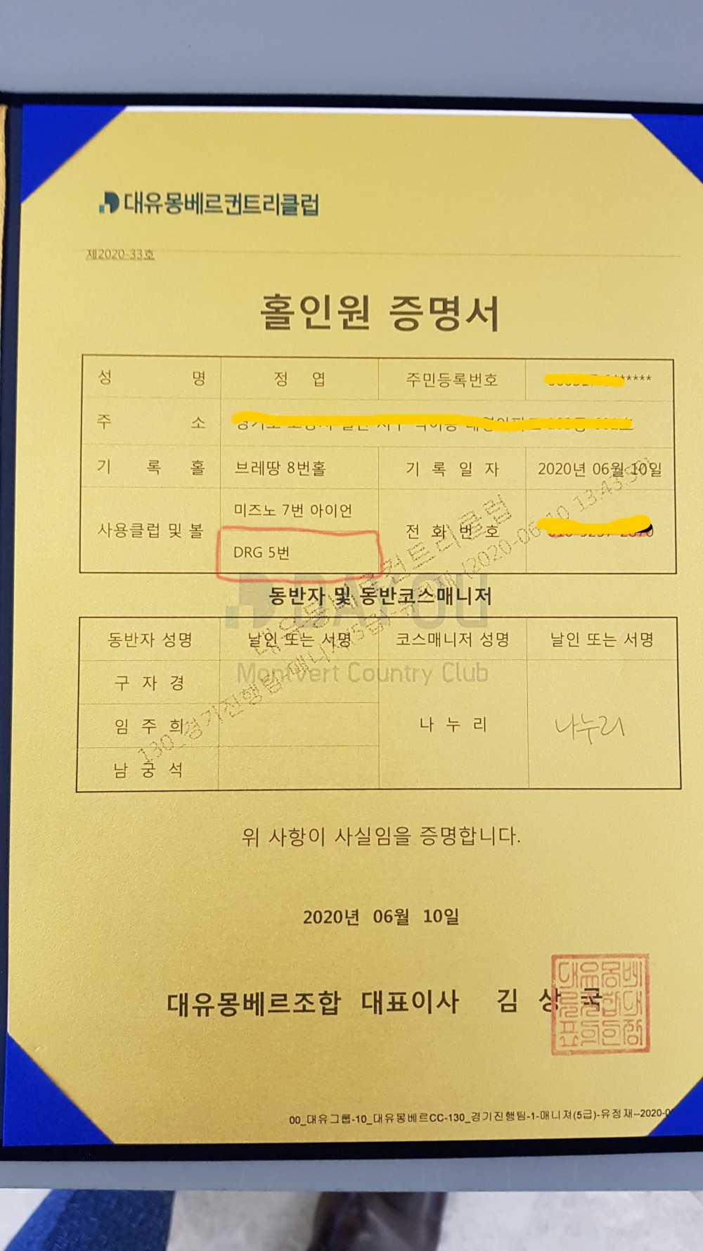 디알지골프공으로 홀인원시 홀인원 증서 및 사용구 인증사진